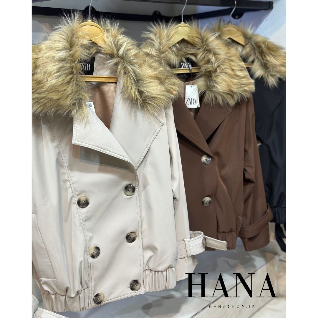 • مدل: کت زنانه یقه خزدار مدل آتین، دو‌ردی، کمر کش‌دار